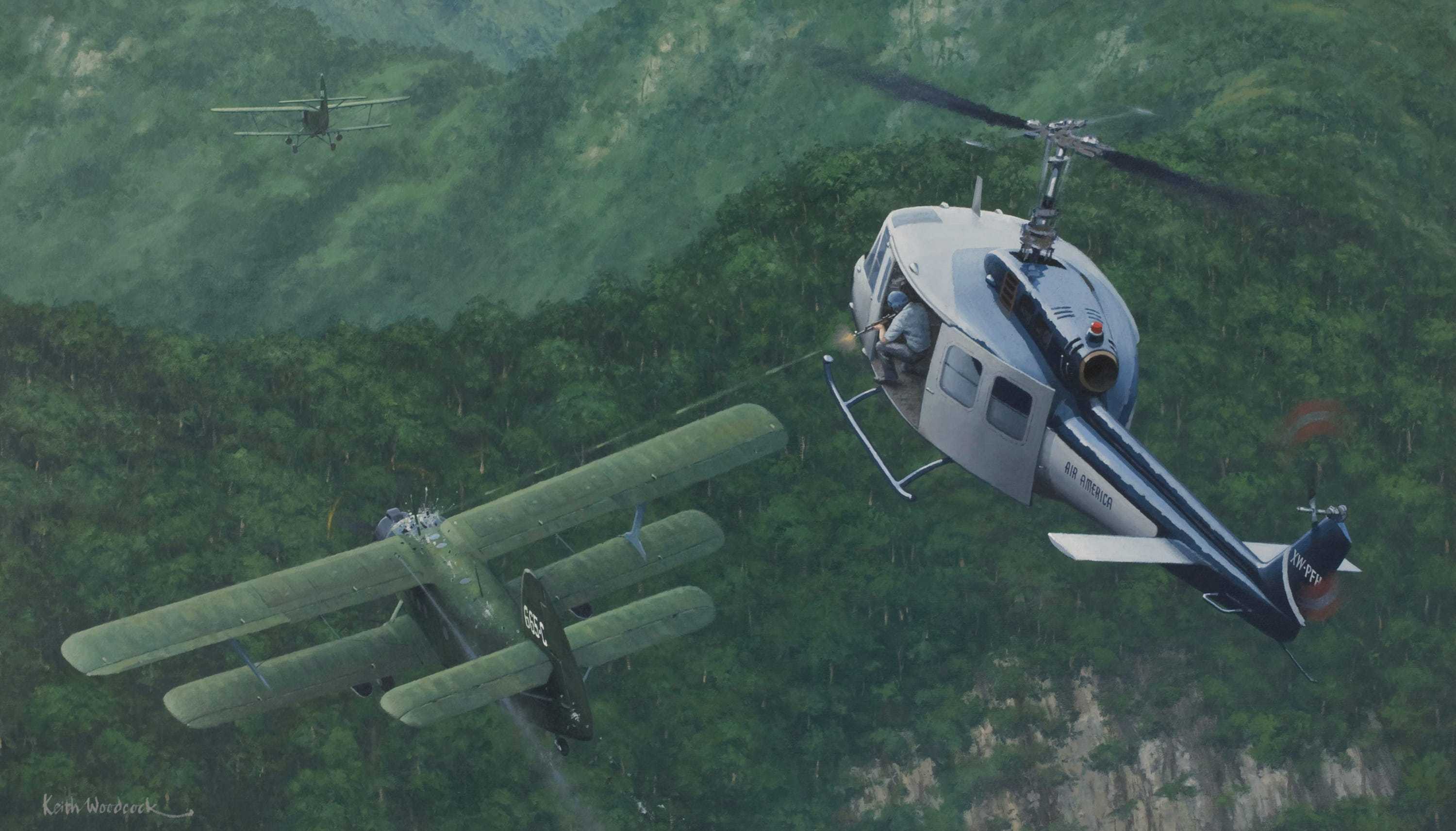 “An Air Combat First” oil painting depicts an Air America helicopter pilot flying alongside an enemy biplane in Laos in 1968 as his flight mechanic fires at it from an open door. ©Keith Woodcock