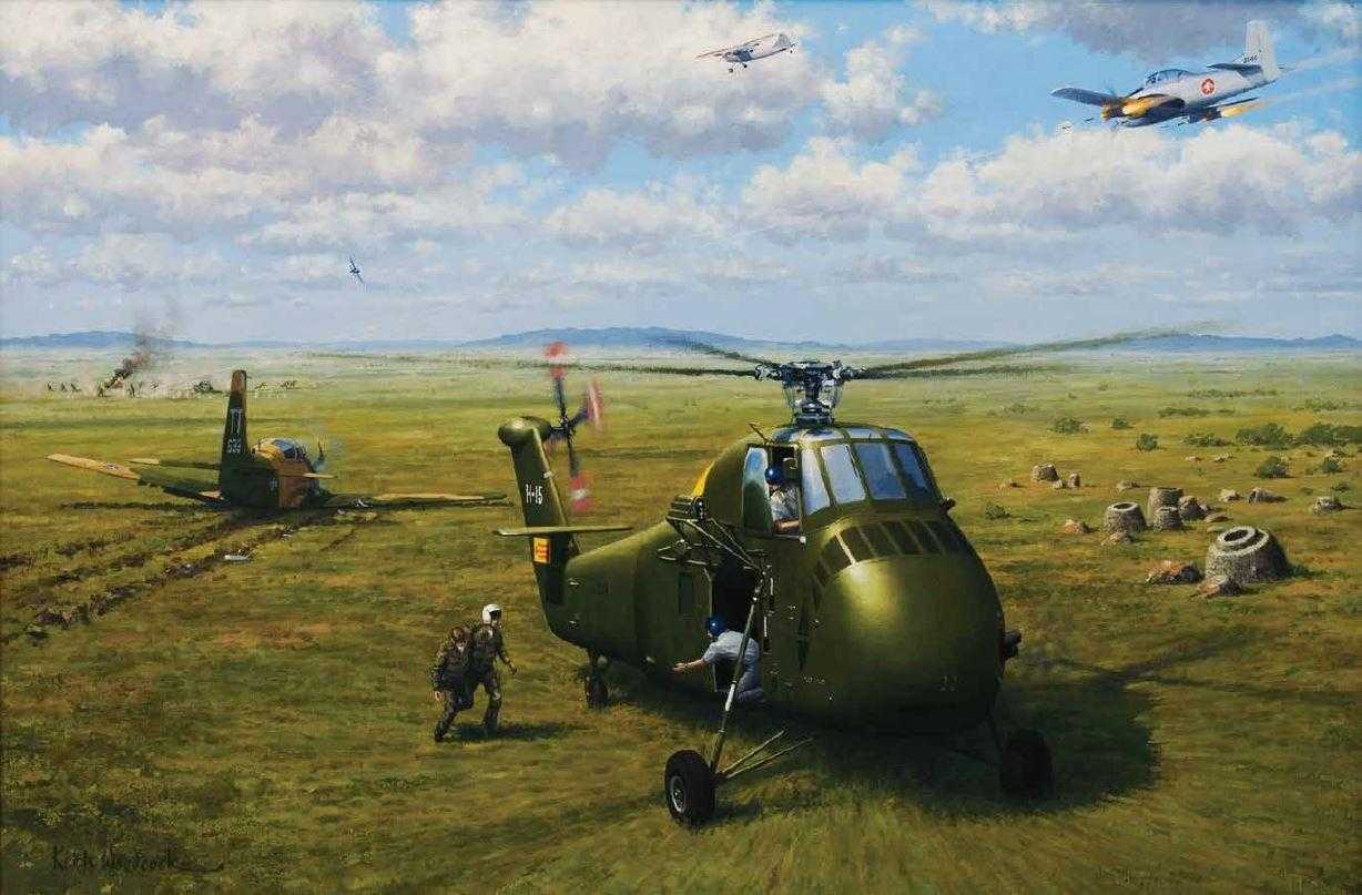 “The Airman’s Bond” oil painting depicts the heroism of an Air America UH-34D crew conducting a rescue of USAF bomber pilots in Laos. ©Keith Woodcock