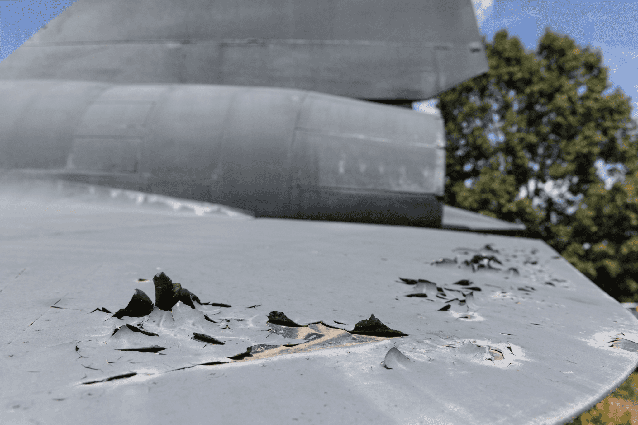 Flaking and damaged paint on the back of the A-12 before its restoration.