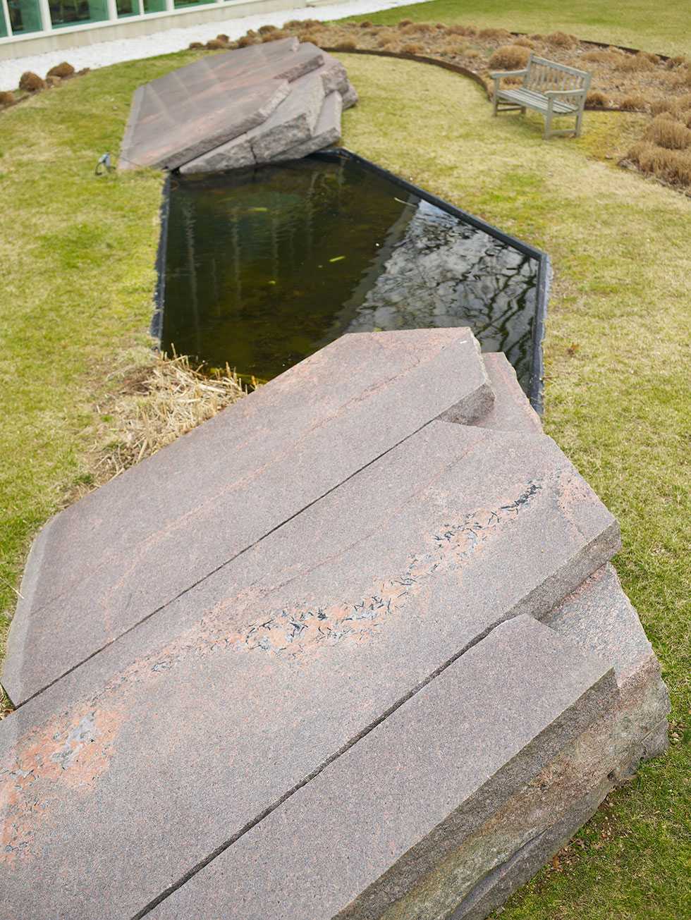 In the courtyard, a calm, reflective pool of water lies between two layered slabs of granite and tall grasses. Directly across from this is the centerpiece of "Kryptos," a piece of petrified wood supporting an S-shaped copper screen surrounding a bubbling pool of water.