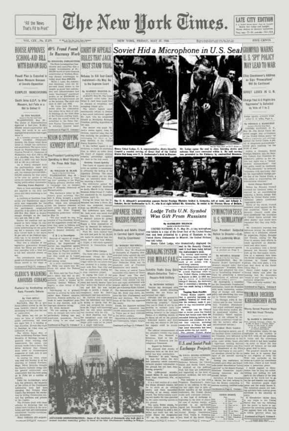 On the fourth day of meetings, on 26 May 1960 – and after three days of accusations from the Soviet Union – Representative Lodge presented his case to dramatic effect. He presented to the members and the cameras a wooden replica of the seal, explaining how the concealed device made its way into the Ambassador’s office and how it operated as a concealed listening device.