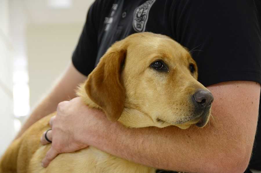Boston, a senior yellow lab belonging to a guest lecturer, keeps a close eye on the handlers as they practice CPR on K9 mannequins. This is just one of the many things the handlers learn during their emergency K9 crisis care classes.