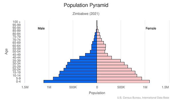 This is the population pyramid for Zimbabwe. A population pyramid illustrates the age and sex structure of a country’s population and may provide insights about political and social stability, as well as economic development. The population is distributed along the horizontal axis, with males shown on the left and females on the right. The male and female populations are broken down into 5-year age groups represented as horizontal bars along the vertical axis, with the youngest age groups at the bottom and the oldest at the top. The shape of the population pyramid gradually evolves over time based on fertility, mortality, and international migration trends.