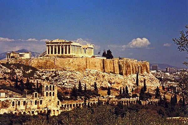 The Acropolis, a flat-topped rock about five hectares (12.4 acres) in area, overlooks the sprawling city of Athens, Greece. Various famous ruins, including the Parthenon, crown its heights.