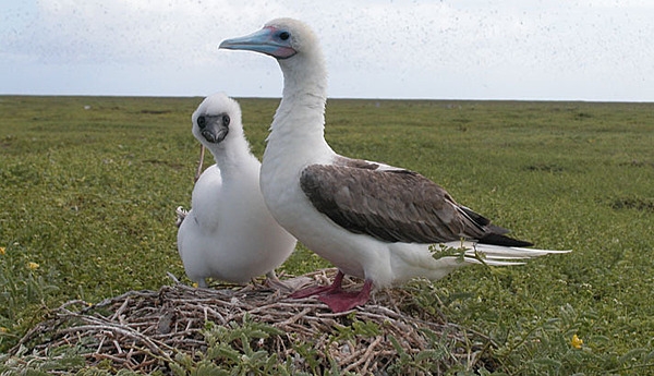 The red-footed booby is the smallest of the dozen booby species. The adult and chick pictured here live on Baker Island, which is part of the US Pacific Wildlife Refuges. Image courtesy of the US Fish and Wildlife Service.